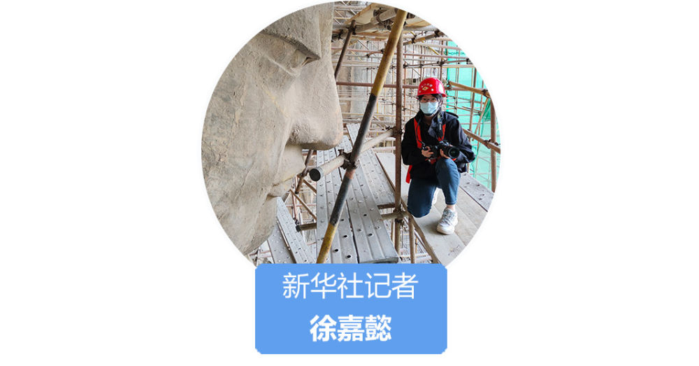 第一眼看到的卢舍那大佛四周搭满了脚手架,蒙着一层层的“绿纱”,作业人员正站在高处的架子上繁忙着。那是我第一次出镜拍照视频,穿戴好防护配备之后,我一手拿着相机,另一只手紧抓着梯子边的钢管,颤颤巍巍向上爬着。脚手架最高离地上将近五十米,踩在木板上的我每一步都走得战战兢兢,稍不留神一个昂首就会撞到钢管,尽管戴着安全帽却仍是好一阵眼冒金星。而那些正在作业的作业人员们却如同身怀绝技的“大侠”,一个个“飞檐走壁”,再高的当地也如履平地。