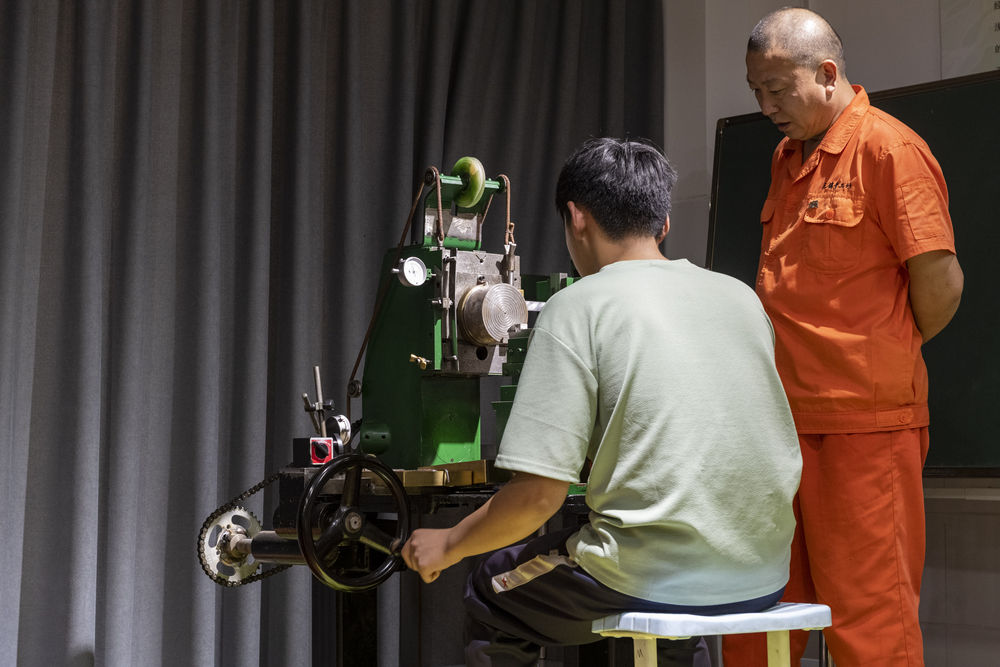 ↑2022年5月23日,程育财在给表盘画线日,程育财在操作机器加工表盘。