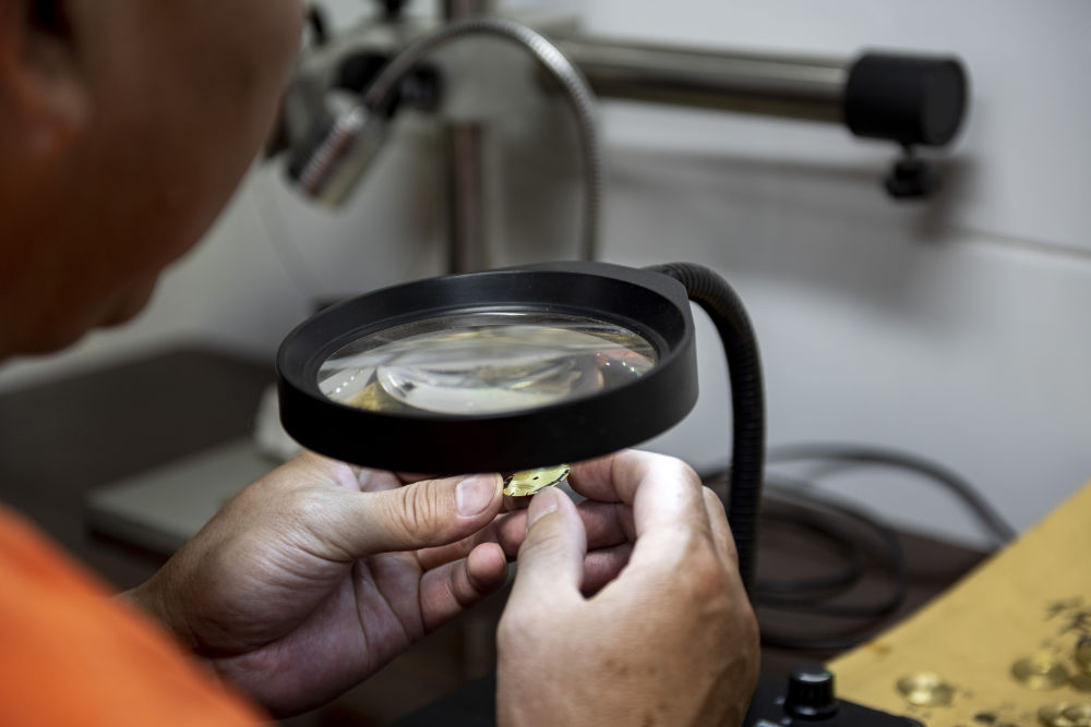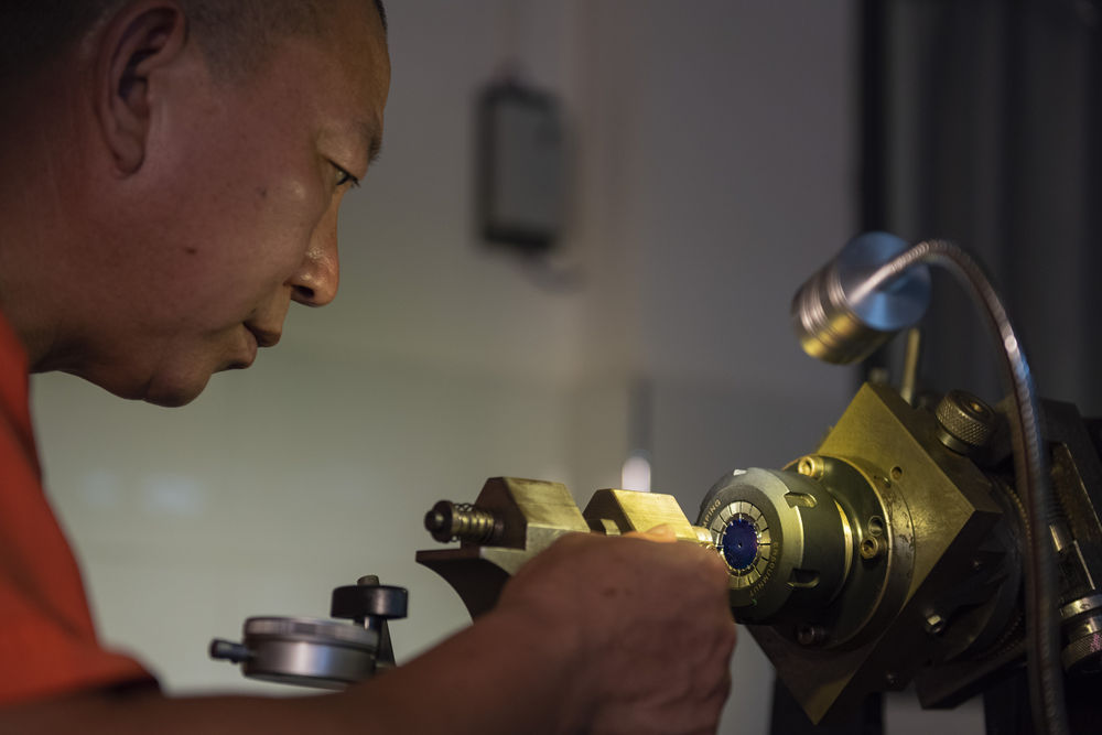 玑雕琢花是制作名表和珠宝的一道重要工序,在手艺雕琢机的辅佐下,经过手指操控被刻外表的斑纹深浅和均匀度,雕琢出精巧纹饰的一种装修工艺。程育财就是为数不多把握玑雕琢花工艺的工匠之一。
