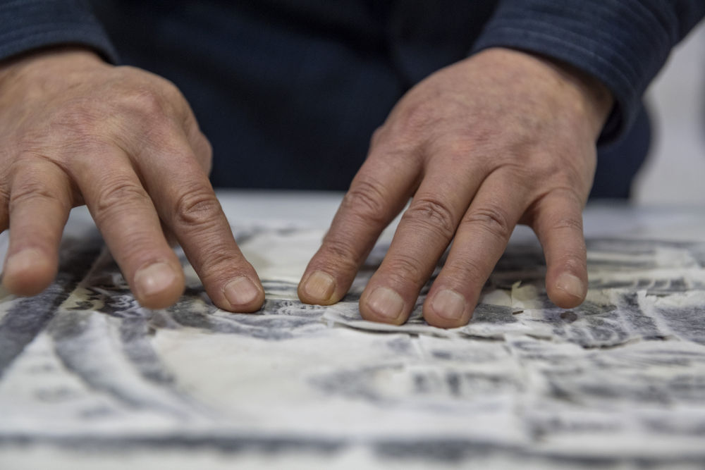 上纸、喷湿、剪纸、砸刷、晒干、扑墨、粘接、修正……一系列流程下来,立体石雕砖上的雕像纤毫毕现地展露在平面拓片之上。与传统的平面拓印不同,高浮雕拓印需求将湿透的宣纸沿立体雕像概括剪开,直压在各个部位,因而拓印后的宣纸呈碎片状,而李仁清则需求把成百上千张的碎片粘接在一同,构成一整幅平面著作。